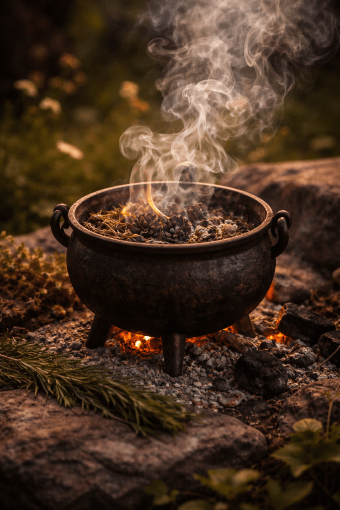 Ashes in the cauldron warm.